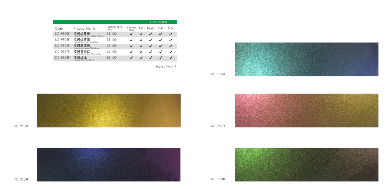 该系列珠光颜料具有卓越的变色效果,多样的色彩变化,色浓度表现优异,光泽度优于市场同类产品。