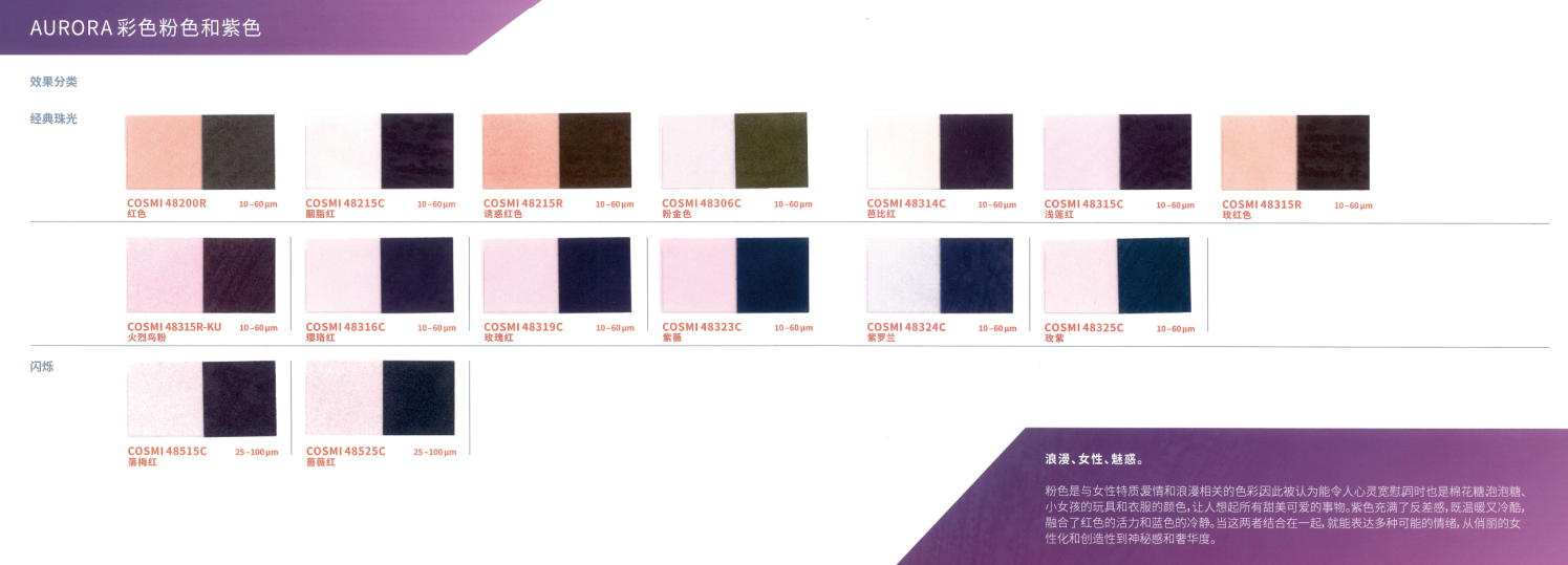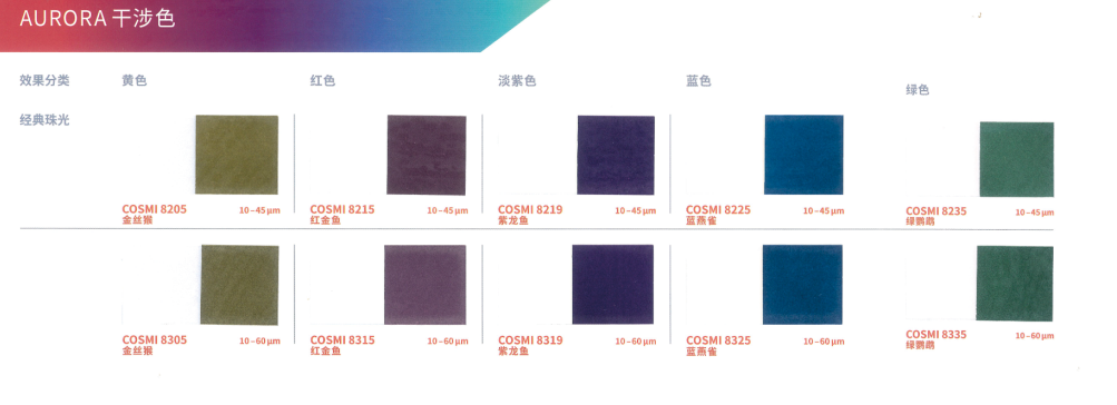本产品采用合成云母基底,表面结构高度光滑规整,赋予其优异的光学性能。与CosPearl系列相比,其色彩表现更为纯净、鲜艳且闪耀,提供丰富色系选择:包括经典银白、干涉色、金色、金属色,以及高饱和度的黄、橙、粉、紫、蓝、绿、黑等强烈色彩,同时支持定制填料。产品具有高透明度与卓越的反射率,色度饱满且稳定(多数Aurora系列珠光颜料呈现纯白粉末基底,确保色彩还原度)。粒径覆盖小、中、粗多规格,可灵活适配不同妆效需求,广泛适用于化妆品及个人护理产品的开发,尤其适合追求高显色度与光泽感的配方设计。