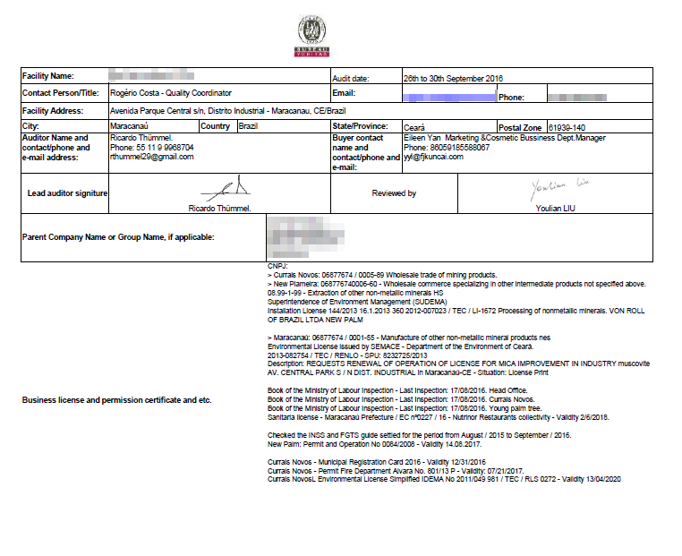 2016年巴西天然云母供应商经第三方独立审核机构Bureau Veritas核查报告